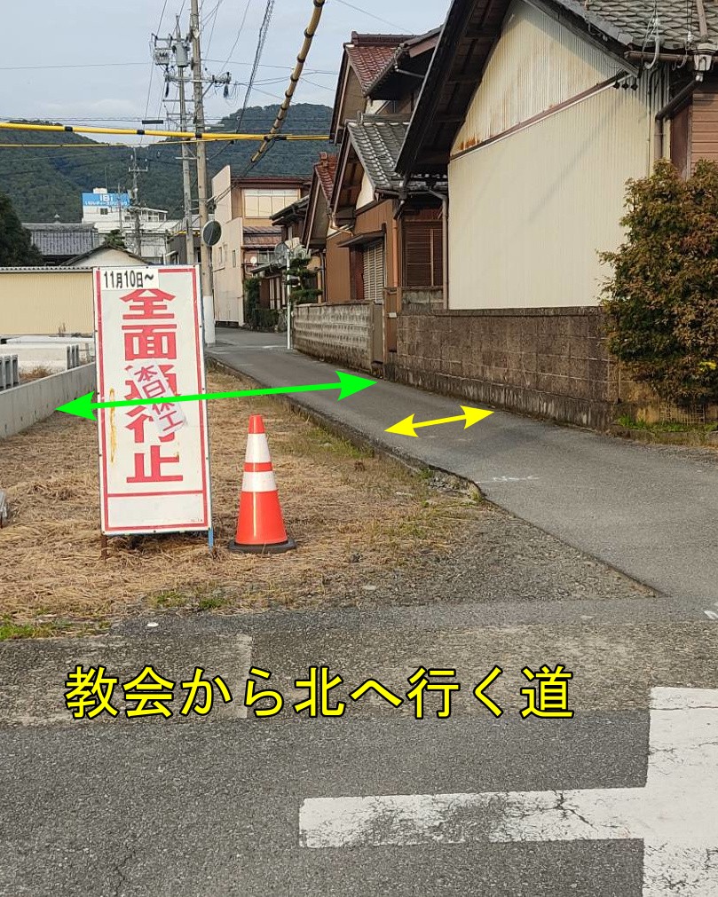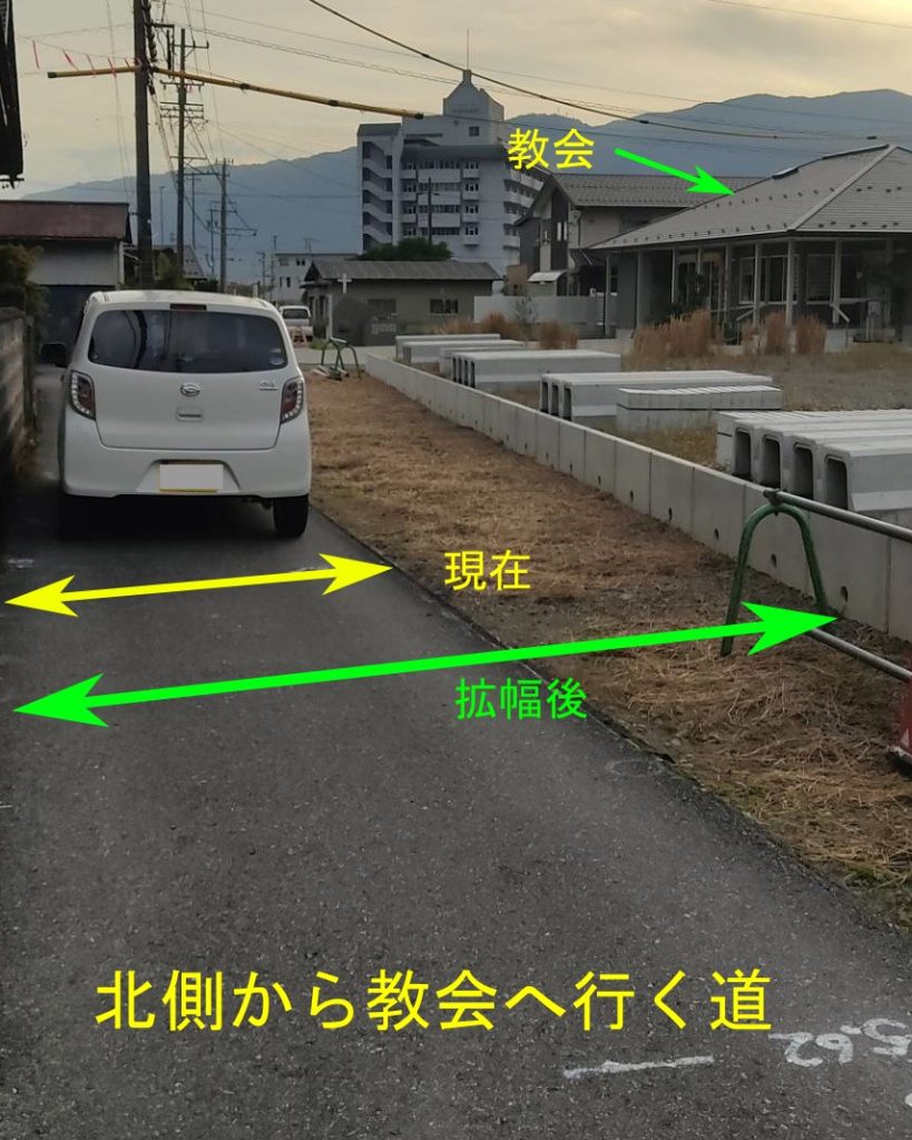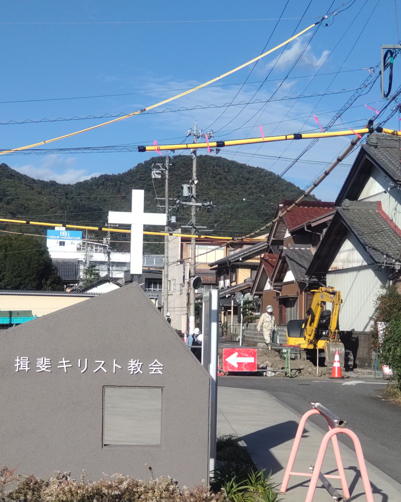 ときどき脱輪する車が見受けられた教会から北側(303号線)に向かう道路の拡幅工事が始まっています。来月中旬には完成のようです。その間の、2025/11/10~2025/12/15までは全面通行止めになります。教会へは、南側(「いび診療所」、「清流の里」)から今まで通りに来れます。