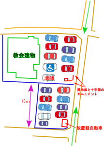4. 教会堂の東側の駐車場(コンクリート)、会堂手前の左手の空き地が駐車場になります。