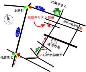 1. 養老鉄道揖斐駅で下車。「ふれあいバス」で上新町まで行き下車。上の地図のお寺(大乗寺さん)のところを右折します。1、2分ほど歩くと、正面やや右手に教会が見えます。